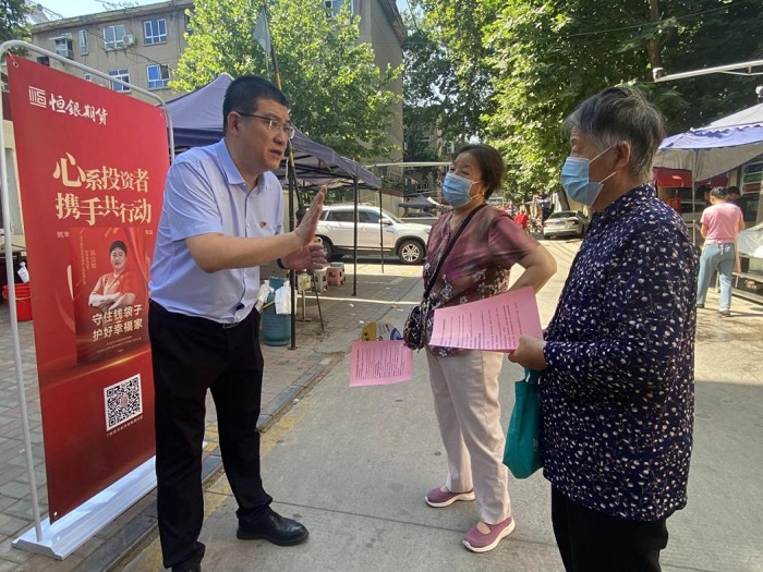 在發放宣傳資料的時候,有位阿姨徘徊不前,恒銀期貨工作人員便上前詢問情況,阿姨跟工作人員介紹了她參與的眾多集資項目,其中包括文玩倒賣、虛擬幣集資等,工作人員一直進行耐心地解答,但讓阿姨立刻接受真相并非易事。據旁邊群眾提供的信息了解到,阿姨的老公腦梗癱瘓在床多年,家庭條件較差,孩子又在外地工作,較容易受到身邊人的蠱惑和誘導。她的經歷讓在場的工作人員深深意識到,在普及非法集資常識的這條道路上任重而道遠。為了方便后期給阿姨提供更多的輔導和建議,工作人員為阿姨留下了聯系電話,并表示將與轄區民警共同維護阿姨的合法權益。