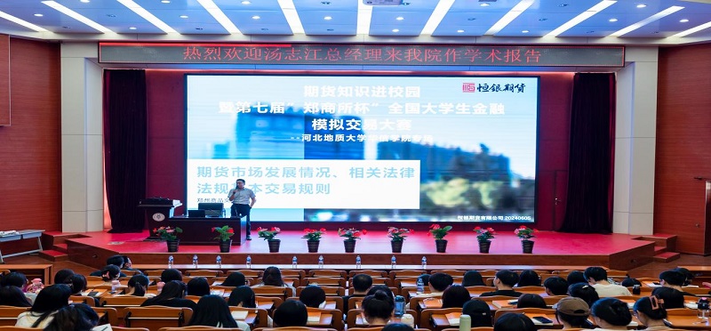 2024年6月5日,恒銀期貨總經理湯志江率領團隊在河北地質大學華信學院報告廳開展了一場別開生面的“期貨知識進校園”活動,并同步舉辦了第七屆“鄭商所杯”全國大學生金融模擬交易大賽——河北地質大學華信學院專場宣講會。為了預熱本次活動,校方在公眾號發布了活動通告,受到了各系學生的熱烈追捧,參會人數超過300人。此次活動旨在加強期貨知識在校園的普及與推廣,提升大學生對金融市場的認識與理解,同時也為廣大師生提供了“鄭商所杯”這樣一個展示才華、交流學習的平臺。